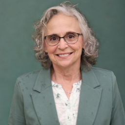 A woman wearing a green shirt and glasses, smiling while standing against a neutral background.